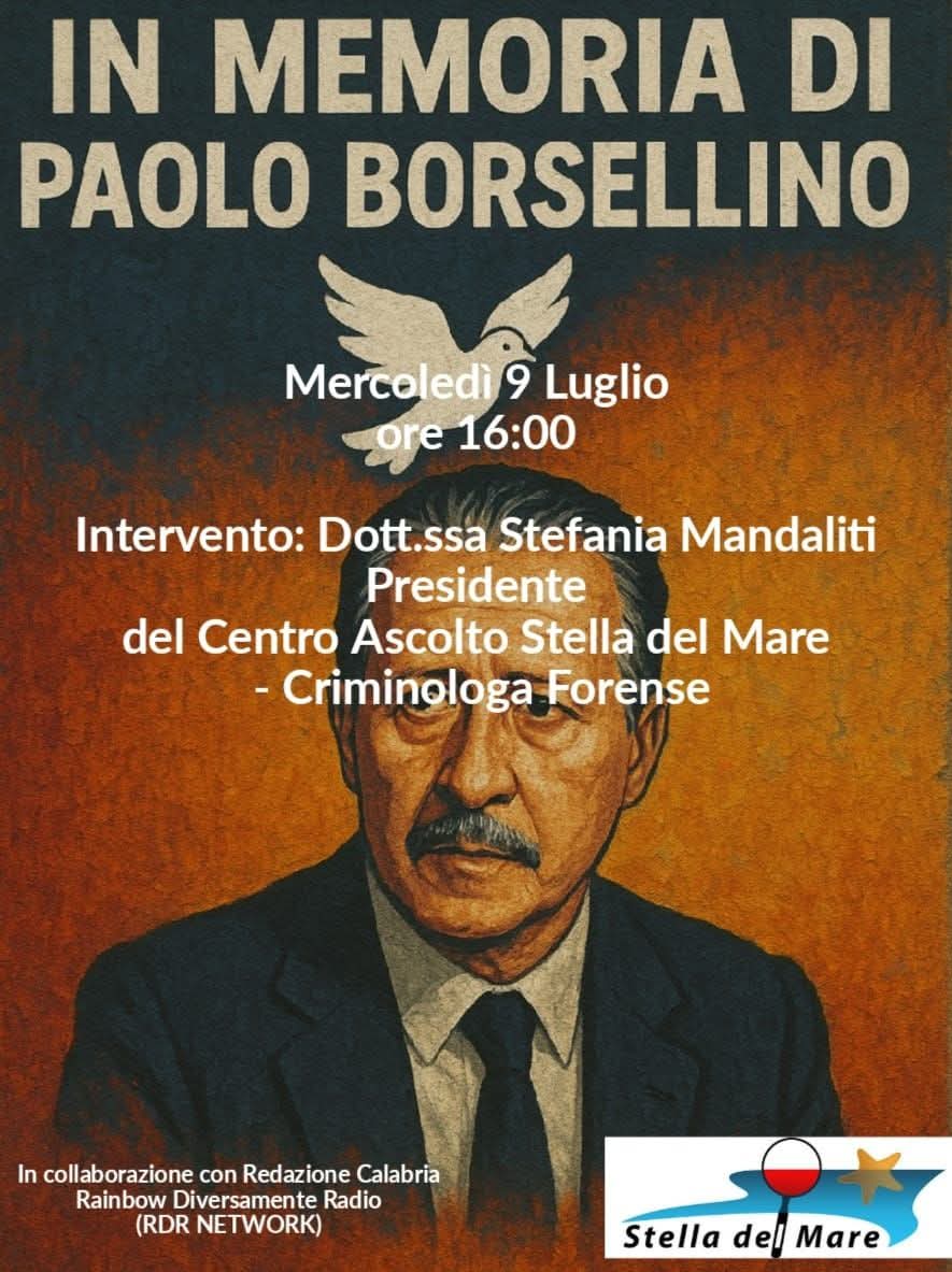 Giorno 9 Luglio 2025, la Dott.ssa Stefania Mandaliti – Criminologa Forense e Presidente dell’ Associazione Centro Ascolto Stella del Mare, attraverso il canale Rainbow Diversamente Radio (progetto di comunicazione sociale dell’ Associazione I Ragazzi della Barca di Carta), ha presentato le attività del Centro inerenti la sensibilizzazione delle nuove generazioni al concetto di legalità. L’ iniziativa nasce al fine di ricordare la Strage in Via d’Amelio.